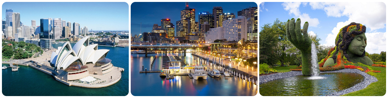 - Darling Habour: Là một trung tâm giải trí quan trọng nhất của Sydney. Tại đây có các khu vườn công cộng và lối đi dạo, nhà hàng, quán bar và khách sạn cùng các điểm du lịch chính như Bảo tàng Hàng hải Quốc gia Úc, Thủy cung Sea Life Sydney và Vườn bách thú Wild Life Sydney.