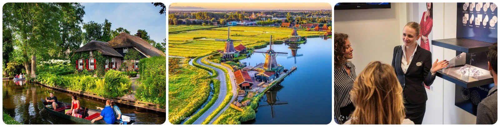 - Tiếp tục hành trình, Quý khách tham quan Zaanse Schans - một ngôi làng đặc trưng của đất nước Hà Lan, cách thành phố Amsterdam khoảng 15 km về phía Tây Bắc. Đây là một không gian yên bình và thơ mộng với những chiếc cối xay gió cổ kính. Đến làng Zaanse Schans du khách sẽ được tham quan, tìm hiểu về văn hóa, lịch sử Hà Lan và mua những sản phẩm truyền thống nổi tiếng của xứ sở hoa tulip. Tại Zaanse Schans, Quý khách tham quan: Nhà máy sản xuất guốc gỗ, Nhà máy sản xuất phô mai.