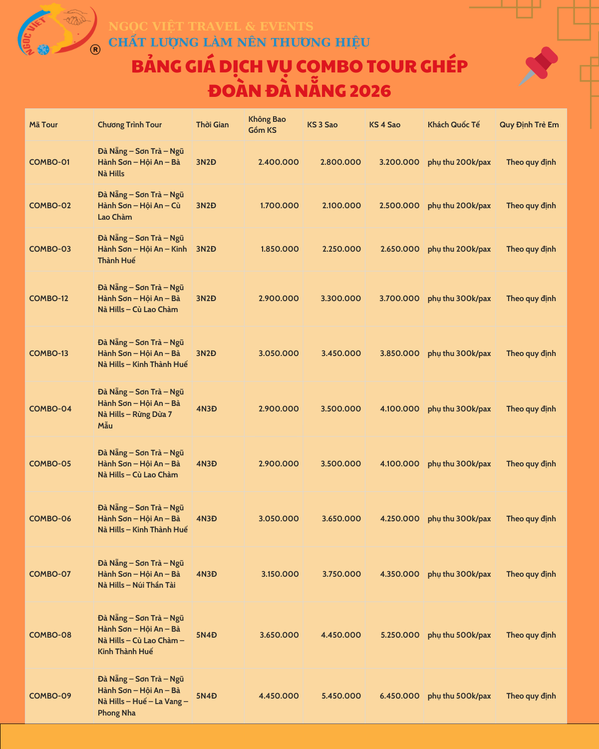 BẢNG GIÁ TOUR GHÉP ĐOÀN MIỀN TRUNG